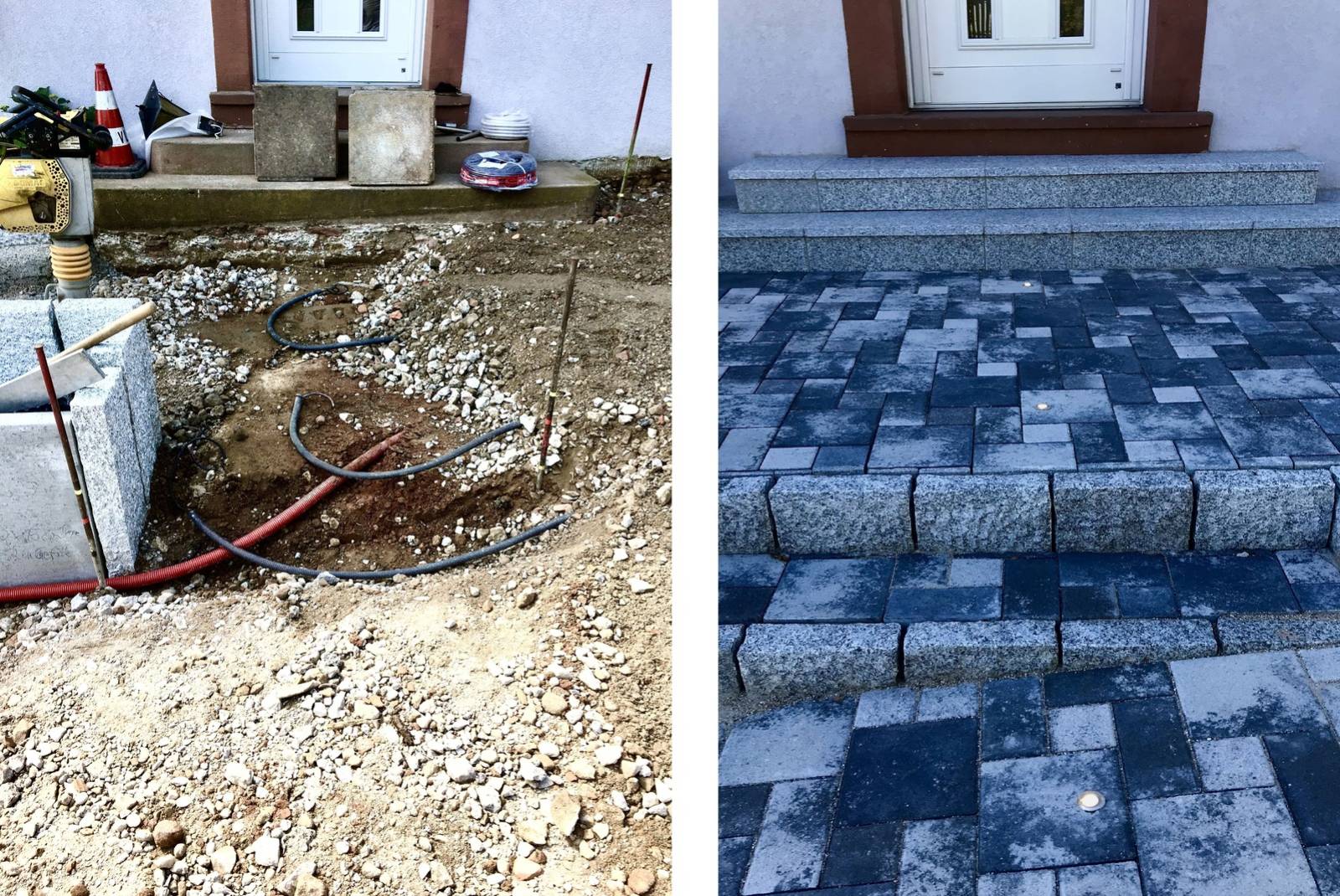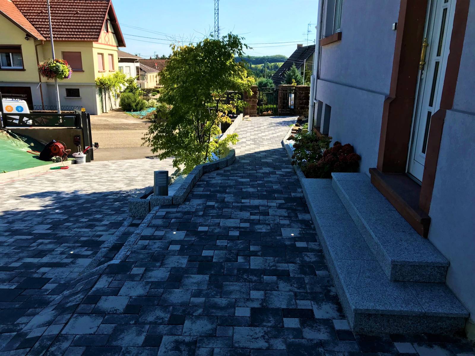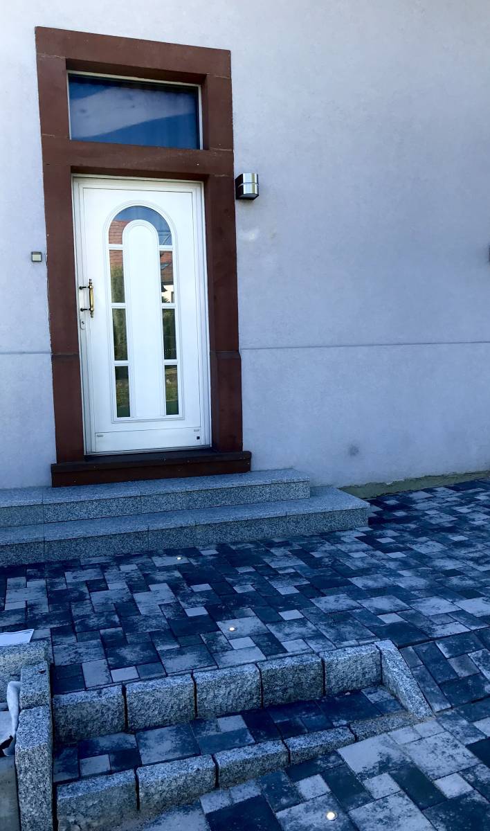Spots encastrés étanches dans les pavés devant la porte d’entrée, alliant esthétisme et praticité.